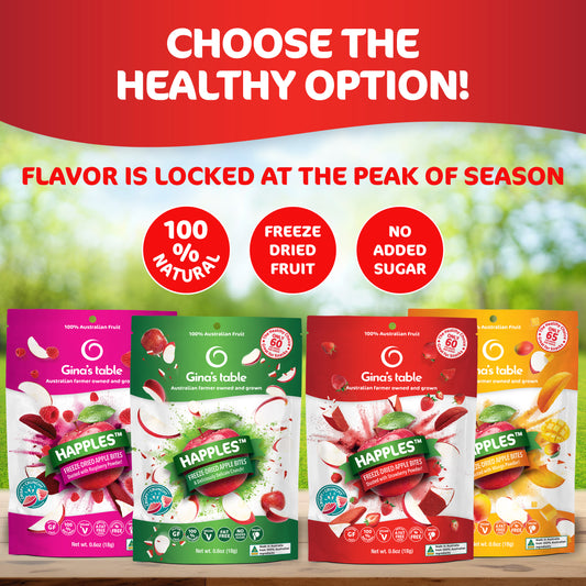 Gina’s Table redefines snacking for families everywhere, where flavor meets nutrition and every crunch delivers satisfaction without compromise. Suspended in time at its seasonal best. Ridiculously yum, naturally sweet, and versatile our Freeze-Dried snacks are perfect for lunch boxes or the go-to ingredient when you want to add a little magic to any dish.